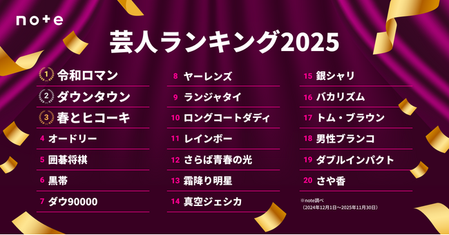 2025年 推し芸人ランキングTOP30発表令和ロマンが3連覇!世代を超えた注目の芸人がランクイン
