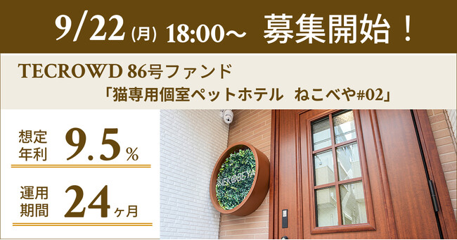 【想定年利9.5%】国内インカムゲイン型ファンド「猫専用個室ペットホテル ねこべや#02」に投資するTECROWD86号ファンドの募集開始