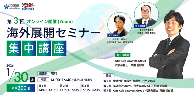 海外展開において重要な知財・AIを活用した特許戦略・国際法務をテーマとした「海外展開セミナー第3回集中講座」を1/30(金)に開催!