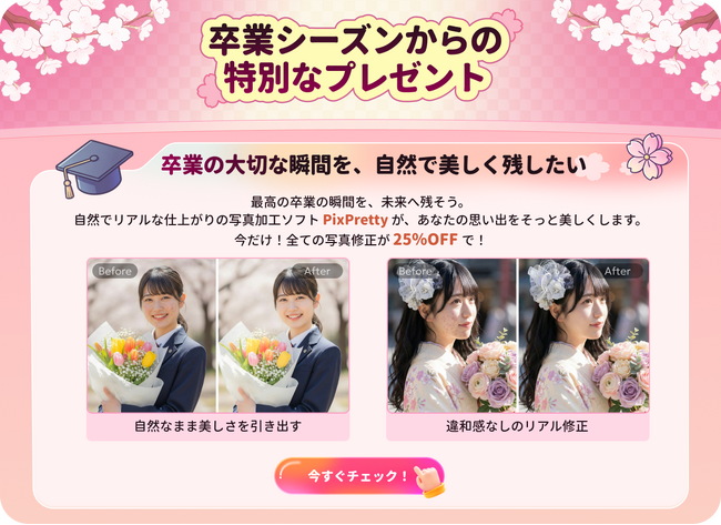 【卒業シーズン必見】AI美肌加工アプリ「PixPretty」で卒業写真をワンランク上に|全商品25%OFFセール開催中