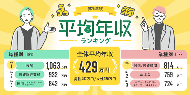転職サービス「doda」、「平均年収ランキング2025」を発表 正社員の平均年収は429万円で、2022年以降3年連続で上昇