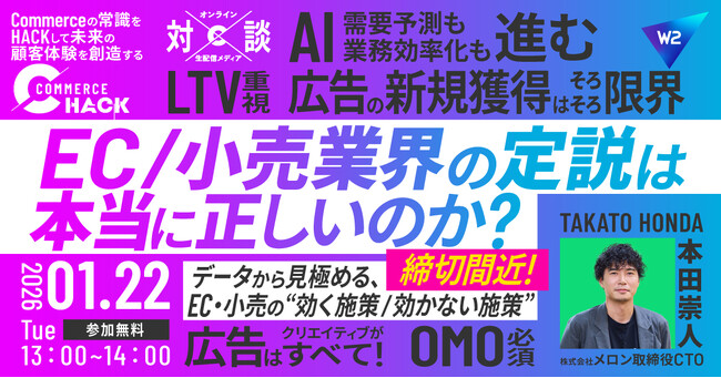 EC/小売業界の定説は本当に正しいのか?データから見極める“効く施策/効かない施策”~映像メディア「Commerce Hack」、1/22(木)オンライン開催~