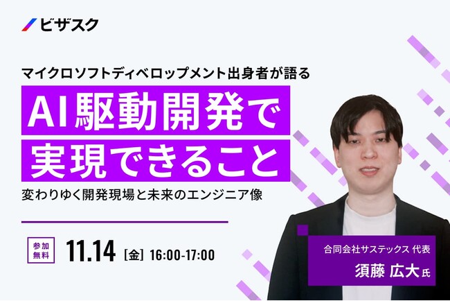 【 11/14 (金) 16:00 】マイクロソフトディベロップメント出身者が語る AI 駆動開発で実現できること 無料オンラインセミナーを開催