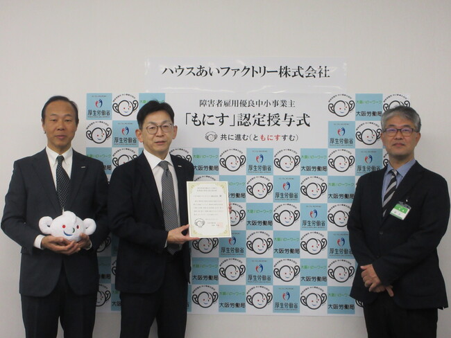 ハウスあいファクトリー 障がい者雇用に関する優良な中小企業を認定する厚生労働省の「もにす認定」を取得