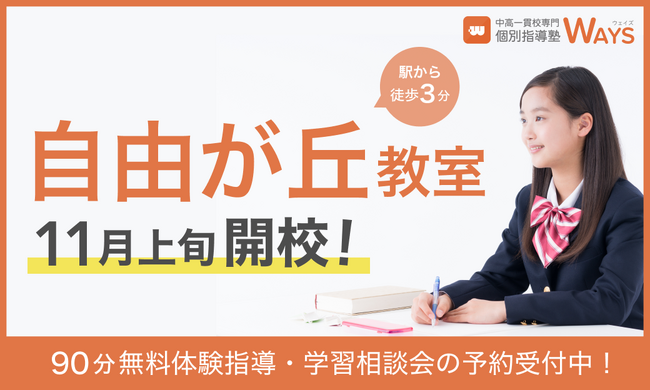 【中高一貫校専門 個別指導塾WAYS】塾生”200名突破”につき自由が丘教室がより駅チカで拡大移転! 11月17日(月)リニューアルオープン。