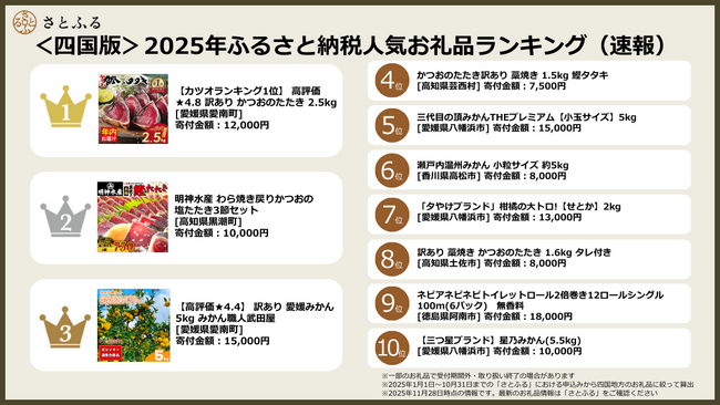 【さとふるニュースレター】<四国版>2025年ふるさと納税人気お礼品ランキング(速報)