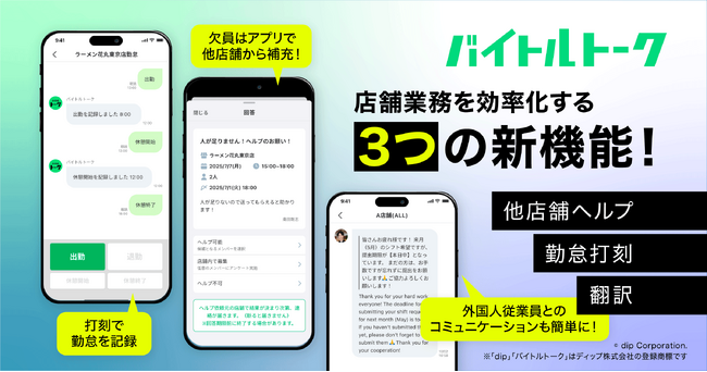 「バイトルトーク」に新機能「他店舗ヘルプ」「勤怠打刻」「翻訳機能」開始 さらなる機能拡充で店長業務の負荷軽減へ